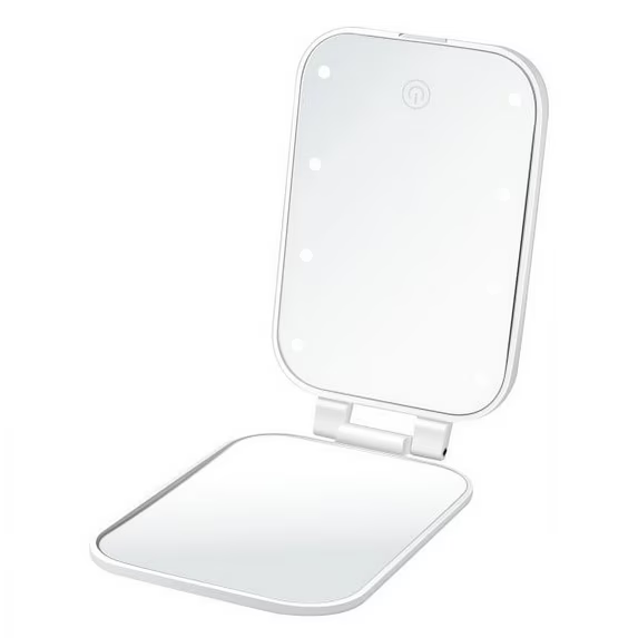 This sleek, portable mirror includes built-in LED lighting, great for makeup touch-ups, grooming, or adjusting accessories while on the go. The compact design makes it easy to carry in your purse or travel bag, and the bright LED ensures visibility even in dim hotel rooms or on long flights.